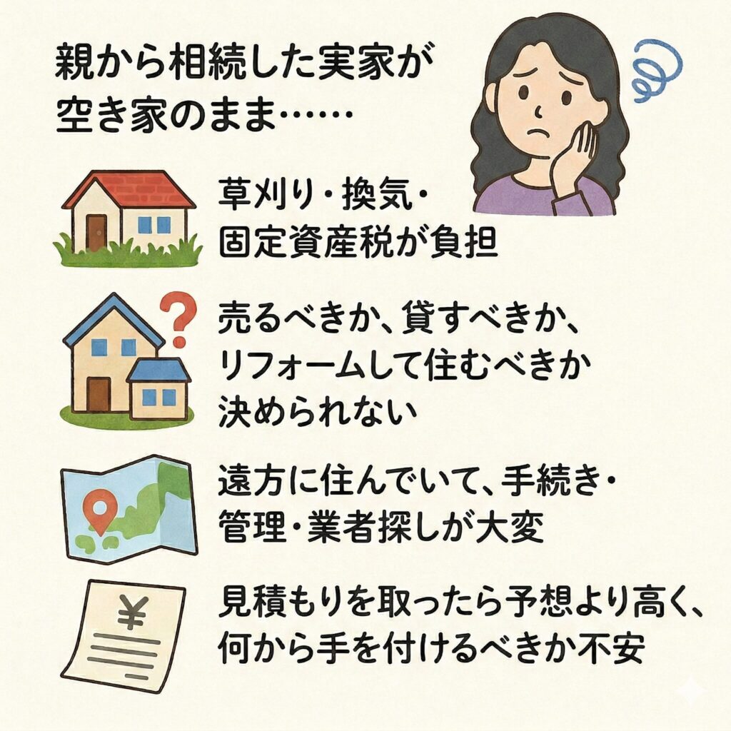 | 向いている人 | 売る・貸す・管理・活用を幅広く相談したい人 | 住む/貸す前提で「直して活かす」方向を検討したい人 |