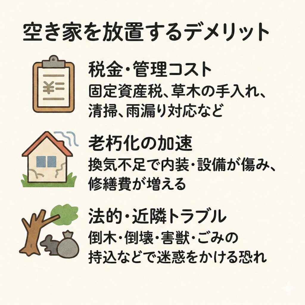 空き家を放置すると、費用もふくらみ心配事も増えてしまいます。
